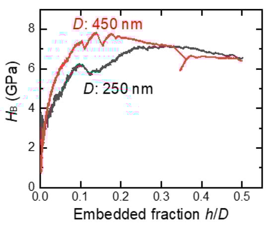 Figure 11 shows the Brinell hardness variations calculated using Equation (3) from the initial stage of particle embedment data in Figure 10. In the embedded fraction range of 0.25–0.50 (d/D range: 0.66–0.87), the calculated Brinell hardness values were close, irrespective of the particle size used to push the Si substrate.