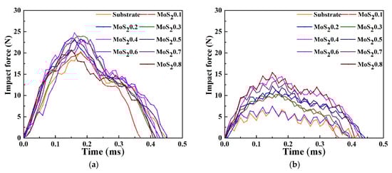 Figure 8 shows the evolution of impact force for different material parameters. As another form of dynamic response in impact testing, the waveform of the impact force also changes with different materials. The peak force of MoS2/C is higher than that of the substrate, indicating that the hardness of the coating was higher. The impact forces at different cycle times are shown in Figure 8a–c. The impact force of the coatings is higher than that of the substrates. The peak impact force of MoS20.4 is always the largest, while that of the MoS20.6 is the smallest. Furthermore, the contact time of the MoS2 coating is lower than that of the substrate as expected. Figure 8d shows that the evolution of peak impact force has three stages. In stage I, the impact force decreases because the wear scar increases with the cycles of impacts, resulting in an increase in the contact area of the ball with the plate. In stage II, the impact force remains basically the same because the wear scar has reached the maximum at this time, and the contact area no longer increases. In stage III, the impact force increases because work hardening occurs.
