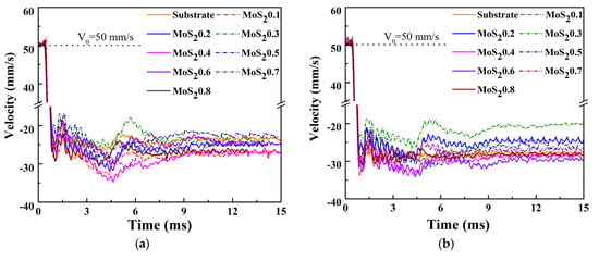 The evolution of the energy absorption ratio of MoS2/C and its substrates is shown in Figure 11b. The energy absorption ratio of MoS2/C slowly decreased and then stabilized at approximately the 2000th cycle. At the beginning of the test, the contact between the impact ball and the plane sample could be regarded as a point contact. At this time, the contact area was small, resulting in a high contact stress between the interfaces and increasing the susceptibility of the sample to plastic deformation and material removal. Therefore, in this process, the coating and the substrate exhibited a high level of energy absorption ratio. As the test progressed and material damage accumulated, the contact area increased and resulted in a decrease in contact stress. In addition, the surface of the wear scar resulted in work hardening during the impact test, which increased the surface strength and improved the wear resistance. Figure 12 shows the deformation of different coatings and substrates, which was obtained by integrating velocity. Consequently, the deformation gradually increased.