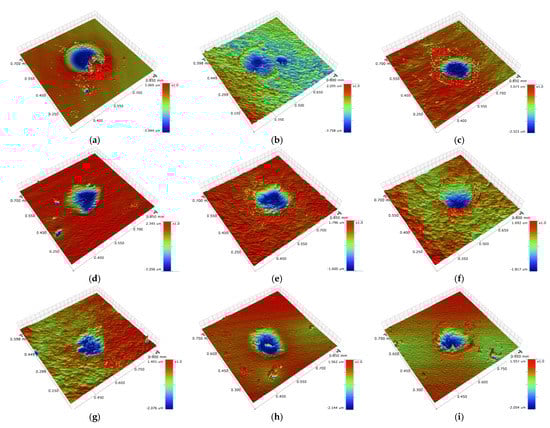 The 3D profile of impact damage was observed through the 3D morphology, and the wear volume was calculated. The results are shown in Figure 13. The wear of the substrate was serious, and severe deformation and accumulation had occurred. Meanwhile, a large amount of abrasive debris had accumulated on the surface of the wear scar. The wear scar area of MoS20.1 was relatively large, but the depth was shallow. The damage of MoS20.3 was worse than that of MoS20.1, which indicates that the wear scar area was similar but that of MoS20.3 was deeper. MoS20.4 had a larger and deeper wear scar area, while MoS20.6 had a lower wear scar area with the slightest wear volume than those of the other samples. The wear of the coating was consistent with the dynamic response in the experiment. Impact damage mainly consisted of plastic deformation and interface wear, depending on the mechanical properties of the material. Under the same experimental conditions, MoS20.4 absorbed more energy and had serious damage, while MoS20.6 absorbed less energy and had less damage, demonstrating that MoS20.6 has a better performance. In Figure 11, the energy absorption ratio of the substrate is lower than that of the MoS2/C coatings, but the wear damage is more serious. This shows that during the impact process, the coating absorbs more energy with little damage, and their mechanical properties are better than the substrate. Figure 13j shows the cross-sectional profiles of all the samples. After 104 cycles of impact test, the wear volume of the substrate is larger than those of the coatings.
