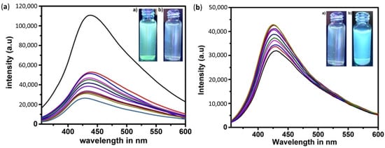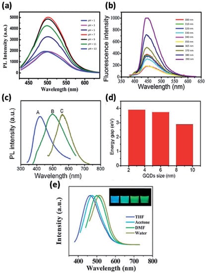 GQDs have a graphene core and indeterminate chemical groups on their surface, and thus, photoluminescence (PL) is organized together by the graphene core and neighboring chemical groups []. Specifically, the graphene core determines the intrinsic emission, while the attached chemical groups control the surface state []. GQDs exhibit greater quantum yield than other carbon-based materials due to the presence of layers in their structure and better crystallinity. GQDs emit different colored photoluminescence contingent to their varying synthesis methods, sizes, layered structures, and chemical functionalizations of their surfaces, free zigzag sites, and superior crystallinity [,]. Figure 3a shows fluorescence spectra of GQDs at different pHs. The other major contributing PL sites on the sample can vary, while the wavelength of the excitation light changes, which can be clearly seen in Figure 3b. Many researchers report that the bandgap of GQDs is induced by their size, and hence can alter their PL []. As the size of GQDs decreases, their bandgap increases. The color of the PL spectra given in Figure 3c is associated with the sizes of GQDs, and Figure 3d represents the energy bandgap with respect to different sizes of GQDs. Figure 3e revealed PL emission of the GQDs in distinct liquid solvents []. The peak shifted from 475 to 515 nm in THF, acetone, DMF, and water. It is believed that the dielectric constant of the solvent from the GQDs determines its emission efficiency in the solvent medium.