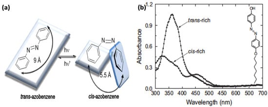 (a) Trans–cis isomerization of azobenzene []. (b) Absorption spectra of the trans-rich and cis-rich photo stationary states of 4-(4′-heptyloxyphenyl) azophenol, shown in the inset. The spectra are measured from a polymeric thin film before and after irradiating with a circularly polarized 375 nm diode laser [].