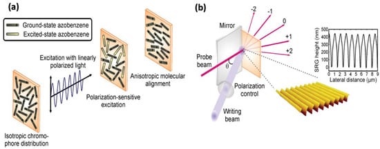 (a) Schematic illustration of the photoalignment of azobenzenes with polarized light. (b) Schematic representation of the SRG inscription process. An atomic-force micrograph and a surface profile of an inscribed grating are shown on the right. (Reprinted with permission from [] Copyright 2013, John Wiley and Sons).