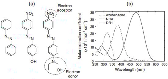 (a) Examples of azobenzene molecules of azobenzene-type (unsubstituted azobenzene, left) aminoazobenzene-type (4-nitro-4′-hydroxyazobenzene (NHA), center), and pseudostilbene-type (Disperse Red 1 (DR1), right). (b) Absorption spectra of azobenzene, NHA, and DR1 in 2 × 10−5 mol/L tetrahydrofuran solution [].