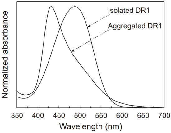 Azobenzene moieties, like most other chromophores with an extended π system, are sensitive to packing and aggregation effects due to chromophore–chromophore intermolecular interactions [,]. The nature of these interactions and the packing arrangement of the chromophores depend on the structure and physical properties of the chromophores as well as on their local environment []. Proximity of the chromophores to one another leads to extensive changes in their electronic transition energies. The effect of chromophore aggregation on the electronic absorption spectrum of DR1 is shown in Figure 7 [].