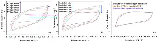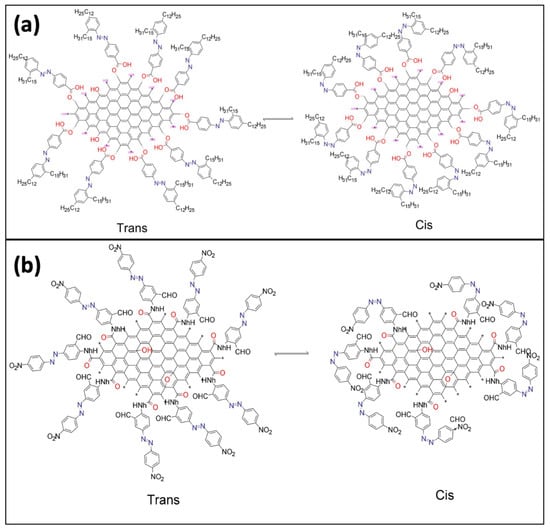 The structure of GO-AZO and GQD-AZO composites and their photoisomerization is shown in Figure 8a,b, respectively. The trans-state appears linear visually, and then conforms to the contracted cis state after absorbing energy in the form of light stimulation. Figure 8a describes the isomerization of an azobenzene group functionalized on GQDs via hydrogen bonding []. Figure 8b describes the isomerization of an azobenzene group functionalized on GO via covalent bonding [].