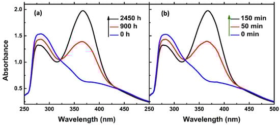 Time-evolved absorption spectra of rGO–bisAzo in (10 mgL−1) Spectra of rGO–bisAzo-1 (a) in darkness and (b) irradiated with green light at 560 nm after UV irradiation. (Reprinted with permission from [] Copyright 2017, John Wiley and Sons).