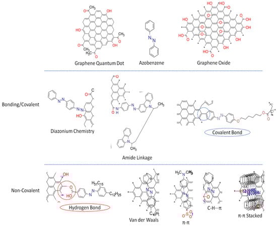 The efficient integration of photo-responsive azobenzene into GDs is an important factor in manipulating their thermal and electrical properties, potentially making them easier to work with in a wider range of applications. The fundamental factor involved in the synthesis of a GD-AZO composite is the interaction between surface functional groups present on the GDs, and small functional groups present on the AZO-polymer chains. For optimum interaction, GDs and the AZO-polymer matrix must be highly soluble in a common solvent. This enables the composite to be synthesized in a way that charge transfer can be maximized. Maximized charge transfer at the interface is important for the fabrication of high-performance conducting nanocomposites. The interaction chemistry between GDs and AZO-polymers includes covalent and non-covalent functionalization. In both cases, it is important to have a well-defined connection between GDs and azobenzenes; if the interaction is weak, the composite formation turns out to be inefficient for most desirable applications []. Bujak et al. explain how covalently functionalized systems possess an advantage over non-covalently functionalized systems by leading to improved thermal stability of the azobenzene, without conferring the disadvantages of “guest–host” AZO systems []. In this regard, covalent functionalization is more advantageous than non-covalent. However, a drawback of covalent functionalization on a graphene surface is the deterioration of the properties related to the transport of electrons or phonons due to the conversion of sp2 carbon into sp3. The functionalization and various types of linkages between the GDs and azobenzenes are summarized in Figure 10.