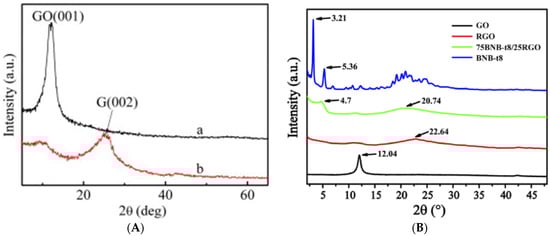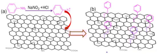 Ran et al. reported the formation of azobenzene derivative (BNB-t8)-RGO hybrid through π–π stacking and hydrogen bonding groups []. The azobenzene moiety in BNB-t8 provides a possible non-covalent π–π stacking interaction with the RGO layer, which improved the electron delocalization and thus the nonlinear optical properties of the hybrid complex. In addition, amide and hydroxyl groups in BNB-t8 provided possible hydrogen bonding interactions with the graphene surface and reinforced the π–π stacking interaction. The schematic of the reaction is given in Figure 15.
