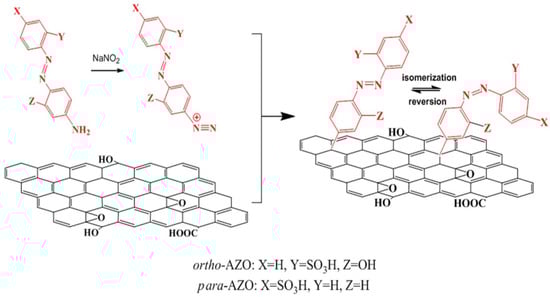 The conversion process of primary aromatic amine into its diazonium salt is called diazotization. In this coupling reaction, the benzene diazonium salt (of azobenzene) behaves as a weak electrophile and attacks carbon atoms with high electron cloud density in the phenol ring, such as hydroxyl (–OH) groups in para or ortho carbon sites of the GDs. Hence, the GDs act as coupling agents to yield AZO-GO composites containing a nitrogen atom in the diazo salt covalently bonded to a carbon atom in the aromatic ring of the GDs. Consequently, GDs are both a part of the chromophore and the template in the hybrid. Pang et al. fabricated GO-AZO hybrids using the same method which is depicted in Figure 11 [].