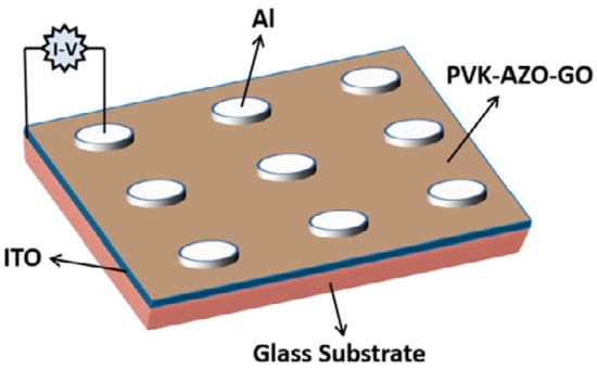 - Zhang, B.; Liu, L.; Wang, L.; Liu, B.; Tian, X.; Chen, Y. Covalent Modification of Graphene Oxide with Poly(N-Vinylcarbazole) Containing Pendant Azobenzene Chromophores for Nonvolatile Ternary Memories. Carbon 2018, 134, 500–506. [Google Scholar] [CrossRef]
