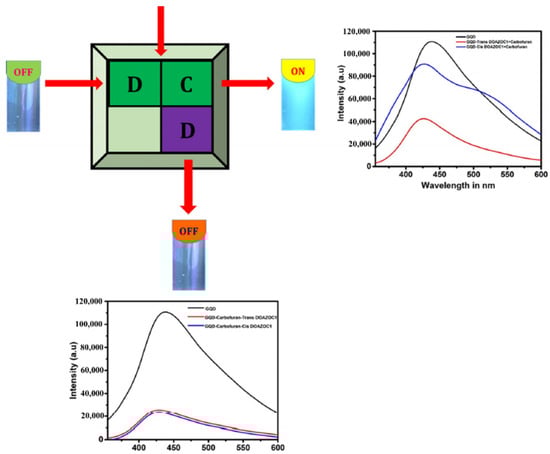 Zhang et al. utilized an unconjugated poly(N-vinylcarbazole) (PVK) with pendant azobenzene chromophores (PVK-AZO) which was covalently grafted onto the surface of GO via amide linkage to produce a new polymer covalently grafted GO-functionalized material, PVK-Azo-GO []. In PVK-AZO-GO, the carbazole moieties act as electron donors (D), while the azobenzene chromophores and GO serve as an electron trap (T) and electron acceptor (A), respectively. This mechanism is explained in Figure 13 [].