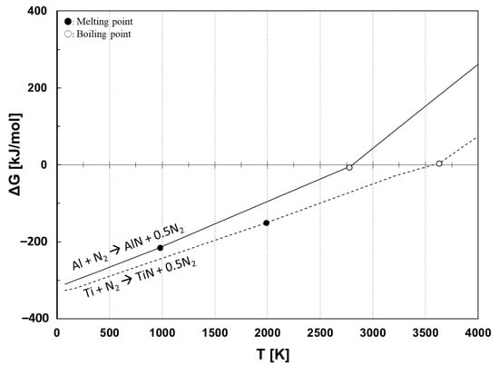Before selecting the electrode material, thermodynamic equilibrium calculation was considered for nitride-forming materials. Gibbs standard free energy was calculated using the chemical thermodynamics computing program (FactSage, Thermfact/CRCT, Montreal, Quebec, Canada, and GTT-Technologies, Herzogenrath, Aachen, Germany). Figure 1 shows the Gibbs standard free energy (ΔG°) change as a function of temperature for synthesizing titanium nitride (TiN) and aluminum nitride (AlN) from their metals, titanium (Ti) and aluminum (Al), respectively. The marked circles and blank circles indicate, respectively, the melting point and the boiling point of the metals. According to Figure 1, the nitridation of Ti and Al materials shows a negative ΔG° until around their boiling point temperatures, indicating that Ti and Al react with nitrogen and synthesize nitrides. Based on the consideration, Ti and Al were chosen as starting materials for the electrodes. A copper (Cu) electrode was also used as a non-reactive material compared to the reactive Ti and Al electrodes.