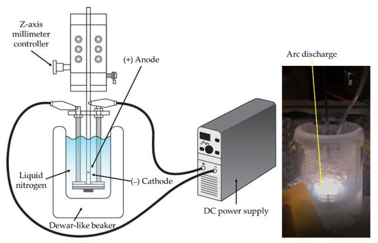 A submerged arc discharge system was developed for the preparation of the metal nitride particles. A schematic of the direct current (DC) arc discharge system and the actual picture of arc discharge in liquid nitrogen are shown in Figure 2. A Dewar flask was used for the liquid nitrogen container to minimize the heat transfer to the surroundings. A diamond blade cut the electrodes to adjust their length. To minimize impurities such as an oxidized layer and organics stains, the electrode surface was ground by sandpaper, followed by ethanol washing. Electrodes were arranged vertically to manipulate the gap distance more feasibly during the discharge. The electrode position was precisely controlled by an anode holder equipped with a z-axis millimeter controller. An arc discharge was generated between two submerged metal electrode rods in liquid nitrogen. The experiments used two kinds of electrode configurations: identical metal electrode configuration and different metal electrode combinations. In the identical metal electrode configuration, Ti (99.5%, Nilaco, Tokyo, Japan), Al (99.9%, Nilaco, Tokyo, Japan), and Cu (99.9%, Nilaco, Tokyo, Japan) electrodes (∅ 3 mm) were used for both electrodes to prepare particles. In different metal electrode combinations, Ti and Cu electrodes were used for the cathode and anode, respectively, or vice versa to investigate the role of the cathode and the anode in the arc discharge for the particle preparation process.