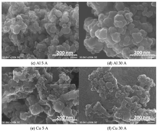 In Figure 3c,d in Al particles, the particles were formed in a spherical shape in both Al 5 A and Al 30 A samples. Figure 3e,f shows the Cu samples. Spherical copper particles and grain-like particles were observed in both current conditions. All the obtained particles shown in Figure 3 had an aggregated form and size ranging from nanometers to micrometers.