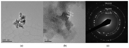 Figure 5 and Figure 6 are TEM images of Ti 5 A and Ti 30 A, respectively. In both conditions, cubic TiN particles were confirmed. The shape of the particles corresponded to the FE-SEM observation shown in Figure 3. Ti 30 A showed relatively bigger particle sizes than Ti 5 A. Figure 5b and Figure 6b show high-resolution images of the individual cubic particles. The images show that the cubic particles had crystal lattice structures. The estimated lattice plane spacing of 0.24 and 0.15 nm corresponded to the TiN (111) plane and the TiN (220) plane, respectively. The phase composition of each product was identified by diffraction patterns obtained from TEM, as shown in Figure 5c and Figure 6c. The SAED pattern showed a dotted ring pattern, which implied that the nanoparticle had crystallinity. Thus, TiN was the main component in both Ti 5 A and Ti 30 A conditions. According to the TEM observation, nanocrystalline TiN particles were successfully produced in this method.
