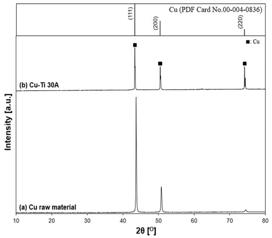 X-ray diffraction patterns of the Cu–Ti sample. (a) Cu electrode raw material and (b) Cu–Ti 30 A: (■) Cu.