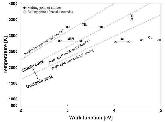 To produce the particles in the submerged arc discharge process, the thermion emission from the cathode is also essential. The stability of the arc discharge depended on the cathode materials, as described in the experimental section. Generally, the thermion emission is related to the material and temperature. Ushio et al. investigated the correlation between the arc discharge stability and cathode thermion emission [53]. Equation (4) is a Richardson–Dushman equation for the thermion emission density at the cathode [54,55,56], where T (K) is the cathode temperature, W (eV) is the work function, kB (J/K) is the Boltzmann constant, and J [A/m2] is the current density at the cathode. The minimum value of the current density required for maintaining arc discharge is 106 A/m2, as reported in many references [34,53]. The proper current density (J) of arc discharge is known to be 106–108 A/m2 [53]. In the equation, A is a thermionic emission coefficient, generally using a value of 6 × 105 A/m2·K2. Figure 19 shows the relationship between temperature and the work function of the materials. The linear dot line in the middle is the minimum current density (J = 106 − 108 A/m2) for maintaining stable arc discharge. The work function has different values according to the plane orientation. Thus, some materials are expressed in the range, referring to other works [57,58,59,60,61].