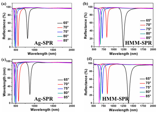 With the surrounding refractive index (SRI) increasing from 1.330 to 1.335, the reflection spectra for the Ag-SPR sensor under different incidence angles are shown in Figure 3a,c, while the reflection spectra for the HMM-SPR sensor at different incidence angles are shown in Figure 3b,d, respectively. When the SRI equals 1.33, the resonant wavelengths are 633, 658, 709, 824, and 1242 nm corresponding to the incidence angles of 85°, 80°, 75°, 70°, and 65°. It can be observed that the resonant wavelength is red-shifted as the incidence angle is increased.