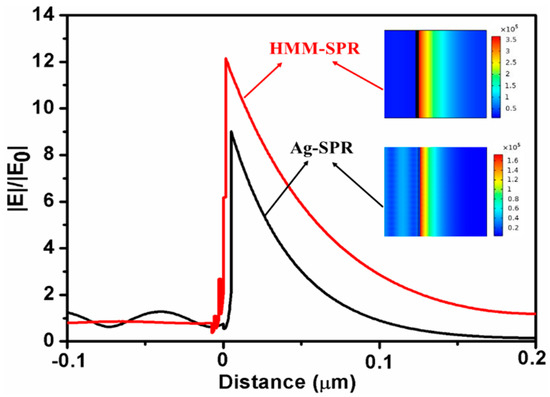 Figure 4 shows the distributions of the normalized optical electric field |E|/|E0| along with the device distance for HMM-SPR and Ag-SPR sensors. It can be seen that the electric field amplitude and the increased penetration depth for the HMM-SPR sensor are both improved distinctly compared with Ag-SPR sensors. The higher sensitivity could be attributed to the enhanced electric field amplitude and the increased penetration depth, which respectively increase the interaction strength and the sensing volume.