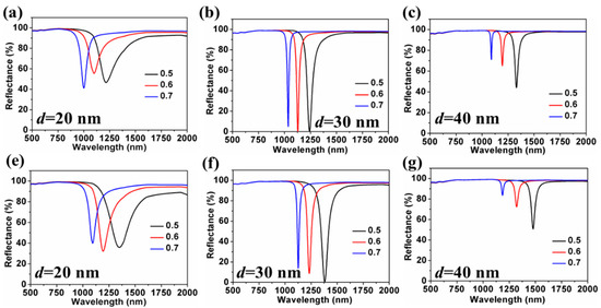 Figure 6a,c and Figure 6e,g show the dependence of reflection spectrums on thickness of the alternating layer (d) and the metal filling fraction (f) for HMM-SPR with SRI = 1.330 and 1.335 respectively. The resonance wavelengths of the sensors are all shown to be blue-shifted with an increase in f. The influence of d and f on the S and FWHM of HMM-SPR are shown in Figure 7. The S increases with decreasing f and increases with increasing d. However, the FWHM is shown to increase with decreasing f and decrease with increasing d. By comparing the reflection spectrum in Figure 6 and S distribution in Figure 7, it can be seen that the higher S for HMM-SPR can be attributed to the higher effective refractive index for SPR at a longer resonant wavelength.