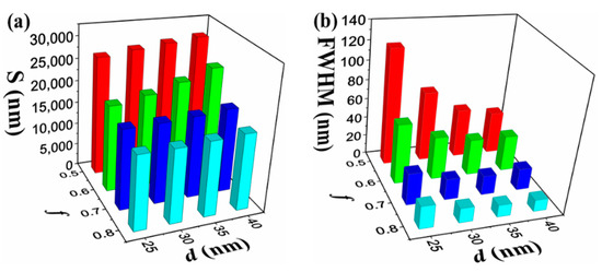 The dependence of S (a) and FWHM (b) on the f and d in the case of SRI changing from 1.330 to 1.335.
