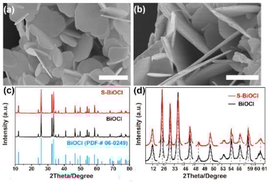 SEM images of (a) commercial BiOCl and (b) S-BiOCl. Scale bar: 1 μm. (c) XRD patterns and (d) partial amplified XRD patterns of commercial BiOCl and S-BiOCl.