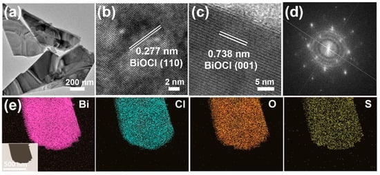 The TEM image of S-BiOCl (Figure 2a) further confirmed the uniformity and homogeneity of the sheets. The high-resolution TEM (HRTEM) images (Figure 2b,c) showed uniform fringe spaces of 0.277 nm, due to (110) lattices of the tetragonal BiOCl, while the interlayer spacing of 0.738 nm corresponding to (001) lattice fringes was observed in the side-view image. The SAED image (Figure 2d) demonstrated the single crystallinity of S-BiOCl sheets. In the elemental mapping of S-BiOCl (Figure 2e), all the four elements were uniformly distributed through the whole sheet, indicating that S was homogeneously doped in the sheet. The analysis of element composition by EDS, together with the XPS, is shown in Table 1. The quantitative decrease in Cl, compared to the stoichiometric ratio of Cl in BiOCl, was very close to the proportion of doped S, which implied that BiOCl was doped in the form of the substitution of Cl atoms with S atoms.