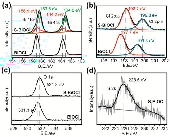 The XPS survey showed the variation in the valence state of S-BiOCl after doping (Figure 3a–c). In detail, the Bi 4f7/2 and 4f5/2 peaks were more constitutive of the main ones at 159.5 and 164.8 eV, which positively shifted by 0.6 eV, than the common peaks of Bi3+ in commercial BiOCl []. Similar changes also happened to Cl 2p and O 1s bands, both of which integrally shifted to high bonding energy by 0.5 eV [,]. The above observations suggested that Bi, O, and Cl in doped samples were partially or totally equipped with more positive valencies than conventional +3, −2, and −1. The valent characteristics of doped S, whose 2s band is located at 225.6 eV in Figure 3d, are very close to the −2 state [,] and dissimilar to characteristic peak of S 2s in thiourea, which was at 228.6 eV []. Meanwhile, no detectable N signal was found (Figure S2), indicating that no thiourea or its derivatives were left in S-BiOCl. Combined with the element composition data by different techniques and the absence of Bi2S3 or BiSCl depicted by XRD, it was fair to conclude that the S element in the valency of −2 was interpolated into the crystal structure to replace the Cl− anions. Meanwhile, the negative valency of S2− relative to Cl− was balanced by the increasing of binding energy and valency of other three elements. The doping of the S element and the resulting effect on the crystal structure were also reflected in the IR and Raman spectra of S-BiOCl (Figure S3). A new band appeared at 1120 cm−1 in IR, which was very close to the characteristic 1106 cm−1 band from Bi-S vibration in Bi2S3 []. In the Raman spectra, the peak at 100 cm−1 and the broad band (200–300 cm−1) with the maximums near 240 and 267 cm−1 were similar to the strongest Ag and B1g Bi-S stretching bands of Bi2S3 [,].
