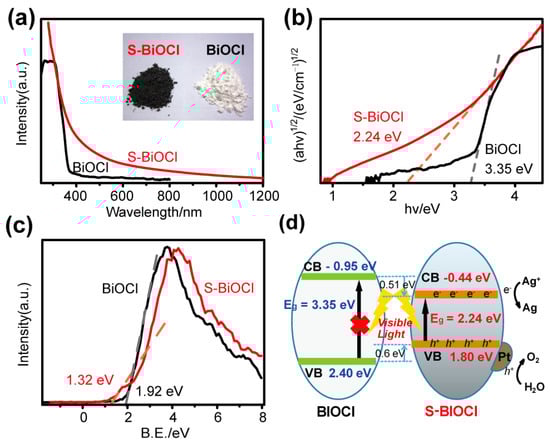 In addition to the decrease in the band gap, as the XPS valence band (VB) spectrum showed in Figure 4c, the VB of commercial BiOCl displayed an energy absorption edge at about 1.92 eV, while that of S-BiOCl upshifted to 1.32 eV. Based on the fact that the valence band maximum (VBM) of pure BiOCl was at 2.40 eV [] (vs. NHE), through theoretical computation, the VBM of S-BiOCl was calculated to be at 1.80 eV. According to the optical absorption spectrum and band gap value estimated by the Kubelka–Munk function, the conduct band minimum (CBM) of S-BiOCl would occur at −0.44 eV, downshifted by 0.51 eV relative to that of pure BiOCl at −0.95 eV (Figure 4d).