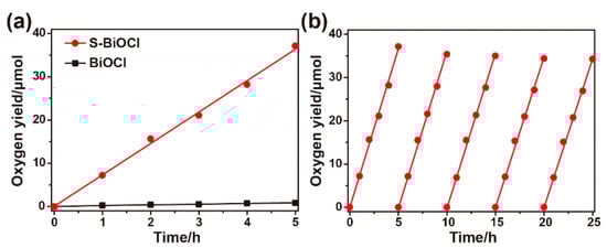 The photocatalytic water oxidation performance of S-BiOCl was studied, with loaded Pt nanoparticles as co-catalyst and silver ions as a sacrificial agent. Pt particles at about 5 nm were successfully loaded on the surface of S-BiOCl sheets by the synergetic reduction of NaBH4 and ascorbic acid in the dark. The inset of Figure S4d clearly shows Pt (111) lattice fringes of 0.227 nm and BiOCl (103) lattice fringes of 0.206 nm. The loading amount of Pt measured by ICP was 1.15 wt%. The Pt-loading S-BiOCl exhibited good and stable oxygen production efficiency in 0.01 mol/L AgNO3 aqueous solution under visible radiation. As shown in Figure 5a, 37.1 μmol O2 was generated after photoirradiation for 5 h when S-BiOCl was used as the catalyst, while only 0.85 μmol O2 was detected with commercial BiOCl as the catalyst. The rate of oxygen generation of S-BiOCl was 141.7 μmol h−1 g−1, which was almost 44 times of that of the commercial BiOCl. Compared with the recent literature (Table S1), S-BiOCl also showed excellent photocatalytic oxygen evolution activity. Moreover, the S-BiOCl showed satisfactory stability in a 25 h cyclic test (Figure 5b).