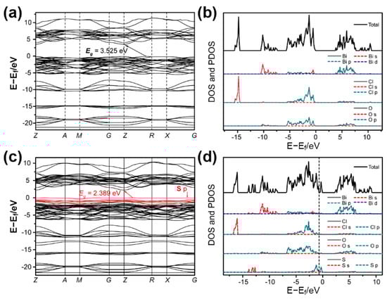 To understand the relationship between the structure and the excellent photocatalytic performance in depth, the theoretical calculation based on density functional theory (hybrid functional, HSE06) using the Vienna ab initio simulation package [] was employed to investigate the variation in the band structure after S doping. Three models (Figure S5d,g,j) were considered according to the S content (almost 30% Cl was substituted) and stable configurations. Compared to the BiOCl (Figure 6a, Eg = 3.525), S doping caused an S 2p state as the VBM, and narrowed the Eg of S-BiOCl to 2.389 eV (Figure 6c). Although the decrease in Eg caused the downshift of CBM and the upshift of VBM, its VBM was still much more positive than E0(O2/H2O) (1.229 eV vs. NHE) []. The total density of state (DOS) and partial density of state (PDOS) results of BiOCl and S-BiOCl (Figure 6b,d) also showed that the emergence of a new energy state in the forbidden band of BiOCl was mainly attributed to the hybridization of S 2p with a little of Bi 6s and O 2p. Furthermore, Bi 6p could primarily account for the hybridization of a more dispersed CB, giving rise to the downshift of CBM. Three doping models in which two S atoms were located at different sites were calculated (Figure S5d–l). All the models gave a narrowed Eg from 1.672–2.389 eV (Figure S6). The calculation results indicated that S doping can narrow the Eg of BiOCl, which can enhance the light harvesting of the catalyst. In addition, S doping could result in higher mobility of photoinduced electrons in CB and holes in VB and inhibition of their recombination []. Hence, S-BiOCl exhibits much better oxygen evolution performance than commercial BiOCl.
