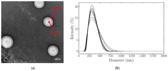 TEM was used to show the structure of the particles. TEM images (Figure 1a) revealed spherical particles with a distinguishable core and surrounding shell.