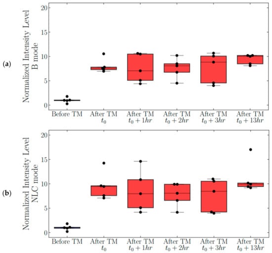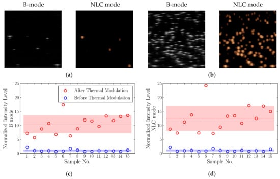 The ultrasound signal intensity on the B-mode and the nonlinear contrast (NLC) mode before and after TM was quantified to determine the change in signal for the nanodroplets that underwent a thermal cycle (Figure 2c,d). The thermal modulation experiment was repeated n = 15 times, and the ultrasound images were acquired before TM at room temperature and after modulation at 37 °C.