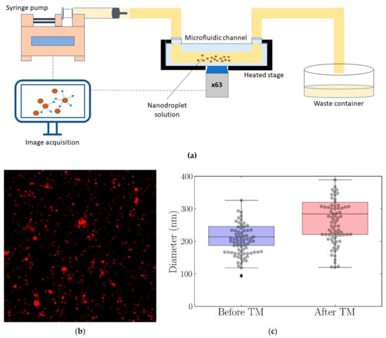 Size distribution of the nanodroplets obtained by confocal imaging in combination with the iPED method. (a) A schematic of the experimental setup used to acquire confocal microscope images of the BSA-TDFH nanodroplets in the microfluidic channel. (b) A representative confocal image used for iPED analysis. (c) Nanodroplet size distribution before and after thermal modulation.