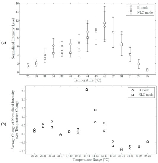 Analysis of thermally responsive nanodroplet behavior. (a) Nanodroplet signal intensity as a function of temperature in the B-mode and the NLC mode (n = 5). The data were normalized by the mean signal intensity at 25 °C. (b) The mean rate of change of nanodroplet echogenicity with respect to temperature plotted over selected temperature intervals.
