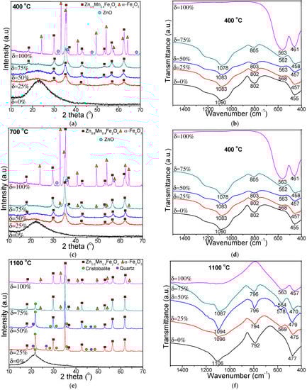 Figure 2 shows the XRD patterns and FT-IR spectra of NPs calcined at 400, 700 and 1100 °C. The degree of crystallinity was estimated as the ratio between the area of all diffraction peaks and the total area of diffraction peaks and amorphous halo [13,16]. In case of δ = 0%, the formation of amorphous SiO2 matrix is confirmed by the broad halo in the 2θ range of 15–30°, at all temperatures. At low calcination temperatures (400 and 700 °C), crystalline Zn0.6Mn0.4Fe2O4 (ZnFe2O4 (JCPDS card 16-6205 [17]) and MnFe2O4 (JCPDS card 10-0319 [17]) phases with cubic spinel structure belonging to Fd3m group are remarked. At 400 °C, in case of the NPs with δ = 25% and 50%, the amorphous halo in the 2θ range of 15–30° is also remarked, but much flatten than in case of δ = 0%.
