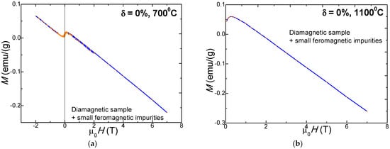 The SiO2 matrix (δ = 0%) calcined at 700 and 1100 °C displays diamagnetic behavior at high magnetic fields, while at low magnetic fields it shows the signature of the presence of a low concentration of some ferromagnetic impurities (Figure 3).
