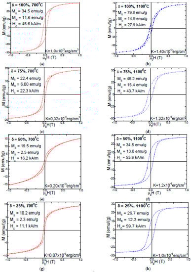 The room temperature magnetic hysteresis loops, the saturation magnetization (MS), remanent magnetization (MR), coercive field (Hc) values of (Zn0.6Mn0.4Fe2O4)δ(SiO2)100−δ (δ = 25–100%) NPs calcined at 700 and 1100 °C are shown in Figure 4.