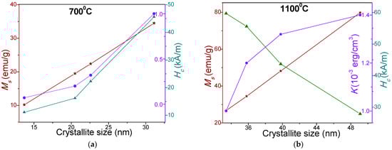 The linear variation of the MS as a function of the crystallite size for the NPs calcined at 700 and 1100 °C is presented in Figure 5. A non-linear increase of the coercivity (HC) (NPs calcined at 700 °C) and magnetic anisotropy constant (K) (NPs calcined at 700 and 1000 °C) and decrease of the HC (NPs calcined at 1100 °C), with the increase of crystallite size is observed. The behavior of HC suggests single magnetic domains for the NPs calcined at 700 °C as HC increases with increasing average particle size and multidomain regime for the NPs calcined at 1100 °C as the HC decreases with increasing average particle size. The reduction of the HC with increasing ferrite content can be connected with the particle sizes.