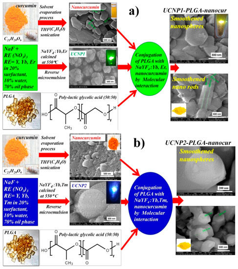 Formation mechanism of (a) UCNP1-PLGA-nanocur, (b) UCNP2-PLGA- nanocur.