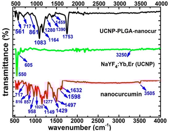 Whereas, the FTIR spectrum of UCNP-PLGA-nanocur exhibits the existence of functional groups present in the nanocurcumin and UCNPs. Among these, the characteristic functional groups of nanocurcumin at 717, 861, and 1280 cm−1 could be identified from the drug incorporated sample. Particularly, the absorption peaks for the nanocurcumin around 861 and 1280 cm−1 experienced a mild shift to 857 and 1277 cm−1 in the drug loaded sample due to nano-encapsulation and indicates successful drug loading. Similarly, the identified metal fluoride functional group of UCNPs at 550 cm−1 also involved with slight shift to 561 cm−1 owing to the interaction between drug and UCNPs. In addition, C−O− stretch of C−O−H groups rose in 1083 cm−1 and also the absorption peak occurring at 1459 denoted for the C−O−H in plane bending of carboxylic acid (−COOH) [31]. It is to be noted that the new strong absorption peak arises from ~1753 cm−1, which might signify the characteristic C=O stretching of acid group due to the interaction of PLGA polymer [25,30]. The small absorption peaks at 1164 and 1280 cm−1 indicate the C−O stretching. The other absorption peaks found at 1390 and 1459 cm−1 are assigned to O−H bending vibrations and C-H bending, C=C stretching vibrations for the aromatic ring independently. It affirms that the nanocurcumin efficiently loaded with UCNPs via PLGA ligands attached on the surface of the nanocarrier. The PLGA functionalization with carboxylic groups could improve the binding affinity between the nanocurcumin drug and the UCNP nanocarrier, which will be useful for drug delivery applications [5].