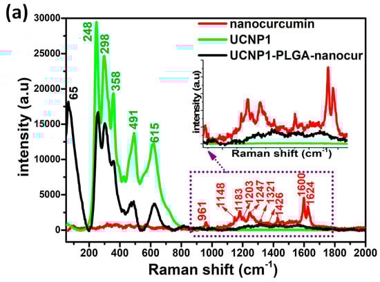 In the case of UCNP1-PLGA-nanocur and UCNP2-PLGA-nanocur, the spectrum displays Raman peaks corresponding to both nanocurcumin and UCNPs, which is an indication of drug loading. No Raman peak is observed above 1000 cm−1 in the UCNP1 and UCNP2. However, the inset of Figure 5a reveals UCNP1-PLGA-nanocur shows Raman modes (1000–1600 cm−1) due to the drug loading of nanocurcumin with the UCNPs. In addition, the major functional groups of UCNPs that lies from 200–800 cm−1 remains unaffected by the incorporation of nanocurcumin except a slight decrement in intensity. Similar results are obtained for UCNP2-PLGA-nanocur displayed in Figure 5b. The Raman spectral result indicates the nanocurcumin and UCNP nanocarrier is conjugated by the PLGA polymer in the UCNP1-PLGA-nanocur and UCNP2-PLGA-nanocur composites, which could be useful for biomedical applications.