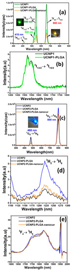 (a) UCL spectra of UCNP1, UCNP1-PLGA and UCNP1-PLGA-nanocur, (b) fluorescence spectra of UCNP1, UCNP1-PLGA, (c) UCL spectra of UCNP2, UCNP2-PLGA and UCNP2-PLGA-nanocur (d,e) fluorescence spectra of UCNP2, UCNP2-PLGA and UCNP2-PLGA-nanocur, respectively.