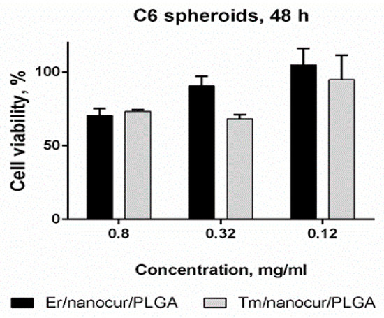 Viability of C6 cells in spheroids after 48 h of incubation with NaYF4:Yb,Er-PLGA-nanocur and NaYF4:Yb,Tm-PLGA-nanocur. MTS assay, the viability of intact cells was taken as 100%.