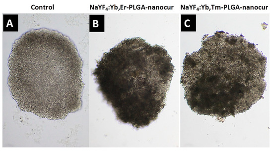 Indeed, C6 cells in spheroids were more resistant to treatment with NaYF4:Yb,Er-PLGA-nanocur and NaYF4:Yb,Tm-PLGA-nanocur in comparison to monolayer culture with viability of 70 ± 6% and 74 ± 3% at 0.8 mg/mL, respectively (Figure 8). The disruption of the outer cell layer of spheroids within 48 h treatment in comparison to control intact spheroid (A) is demonstrated on (B, C) in Figure 9. By using the confocal fluorescent microscopy, the cell viability in glioma C6 spheroids was visualized with calcein AM (alive cells) and propidium iodide (dead cells) staining (Figure 10). Propidium iodide staining (in red) of cell nucleuses confirms partial cell death in spheroids under NaYF4:Yb,Er-PLGA-nanocur (A) and NaYF4:Yb,Tm-PLGA-nanocur (B) treatment.