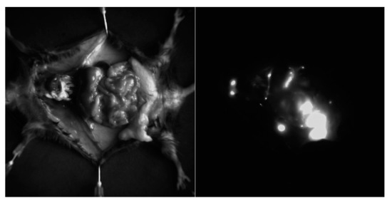 Bright-field image of the mouse organocomplex (left) and epiluminescent image of the mouse organocomplex marked with NaYF4:Yb,Tm -PLGA-nanocur (right), intravenous injection of 0.75 mg UCNPs, 4 h after injection.