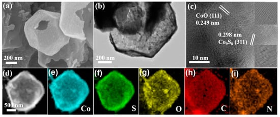 SEM was used initially for the exploration of the morphology and microstructure of the ODR-Co9S8/CoO/NC heterostructure. As shown in Figure 2a, ODR-Co9S8/CoO/NC retained the uniform polyhedral structure inherited from the precursor (ZIF-67), while the cracks confirmed its hollow nature with shells of 20–30 nm in thickness. TEM images further revealed that the hollow polyhedral structure was consist of nanoparticles with an outermost carbon layer (Figure 2b). In Figure 2c, more speculation by HRTEM has declared that these nanoparticles were composed of both Co9S8 and CoO (hetero particles). Moreover, lattice fringes profiles (Figure S6) were conferred with 0.298 nm and 0.249 nm interplanar spacing that were assigned to (311) and (111) planes in Co9S8 and CoO, respectively [,]. Energy-dispersive X-ray analysis (EDX) (Figure S7) and energy-dispersive elemental mapping results (Figure 2d–i) further proved the coexistence and homogeneous distribution of Co, S, O, and N elements in the carbon matrix.