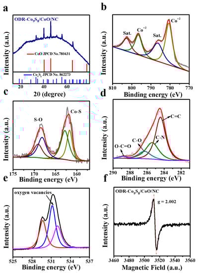(a) XRD signals for ODR-Co9S8/CoO/NC heterostructures; (b–e) Core-level spectra of Co 2p, S 2p, C 1s, and O 1s elements of ODR-Co9S8/CoO/NC heterostructures; (f) EPR for ODR-Co9S8/CoO/NC.