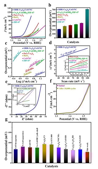 The OER activity of the ODR-Co9S8/CoO/NC heterostructure was electrochemically accessed in a conventional three-electrode system in 0.1 M KOH solution. For control samples, under the same conditions, the OER performances of ZIF-67, Co3S4/Co(OH)2/ZIF-67, CoO/NC, pure Co9S8, and commercial RuO2 were also taken. Figure 4a shows that the ODR-Co9S8/CoO/NC heterostructure exhibited superior OER performance to other reference samples and η values (at JOER = 10 mA cm−2) of all catalysts are summarized in Figure 4b. The improvement in the catalytic activity of the ODR-Co9S8/CoO/NC in OER can be rationalized by rapid charge transfer and water dissociation induced by the generation of oxygen defects and the in situ formation of heterojunction [,]. Theoretical results have shown that the introduction of oxygen vacancies and heterojunction modulates the surface electronic structure of the catalysts by inducing denser electron density around the Fermi level, [,] where oxygen vacancies tend to generate inter-band states for improved conductivity and the formation of heterojunction remodels the d-band center to circumvent unwanted charge transfer resistance for fast reaction kinetics. Clearly, the ODR-Co9S8/CoO/NC heterostructure possessed the lowest η (217 mV), as compared to those of ZIF-67 (712 mV), Co3S4/Co(OH)2/ZIF-67 (335 mV), CoO/NC (367 mV), pure Co9S8 (315 mV) and RuO2/C (290 mV). The kinetics of the catalyzed OER was studied by Tafel slopes using the polarization curves (Figure 4c) []. The ODR-Co9S8/CoO/NC heterostructure showed a Tafel slope value of 70 mV dec −1, distinguishably lowest among ZIF-67 (234 mV dec−1), Co3S4/Co(OH)2/ZIF-67 (146 mV dec−1), CoO/NC (132 mV dec−1), pure Co9S8 (87 mV dec−1) and RuO2/C (79 mV dec−1). This lowest Tafel slope value (70 mV dec−1) of ODR-Co9S8/CoO/NC heterostructure suggested that one-electron equilibrium proceeds a chemical rate-limiting step in OER []. In addition, at the electrode/electrolyte interface, the ECSA of different reference catalysts was determined from their Cdl values which were calculated from CV curves in Figure S8a–c. As depicted in Figure 4d and Table S2, the ODR-Co9S8/CoO/NC possessed a greater Cdl value (39.4 mF cm−2) than those of pure Co9S8 (6 mF cm−2), Co3S4/Co(OH)2/ZIF-67 (4.1 mF cm−2), CoO/NC (2.8 mF cm−2) and ZIF-67 (1 mF cm−2) suggesting numerous exposed active sites in the OER reaction. Moreover, ECSA normalized linear sweep voltammetry (LSV) curves (Figure S9a) of the ODR-Co9S8/CoO/NC demonstrating superior OER performance to ZIF-67, Co3S4/Co(OH)2/ZIF-67, CoO/NC, pure Co9S8, and RuO2/C which further indicates that the enhancement in intrinsic activity is due to the improved conductivity due to oxygen vacancies in ODR-Co9S8/CoO/NC heterostructure.